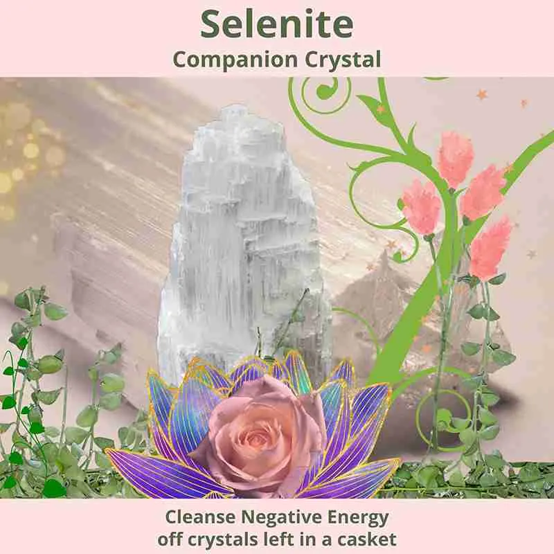 Selenite is a powerful stone that can be used to cleanse and charge other crystals and stones in the coffin. It is also effective for clearing chakras and cleansing the aura. Selenite is often used to cleanse the chakras of other stones and to charge them with its high vibrational energy.